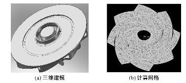 以D450607型的脱碳多级离心泵为例。该多级泵为7级泵单元,叶轮叶片7片,导叶叶片8片,泵流量410m3/h,总扬程3.4MPa,泵转速比重现单位为1480r/min,电机配用功率850kW,泵送物质碳酸丙烯酯比重1.1198。优化设计将原叶片改为全三元高效叶片,保持原工况与叶轮安装尺寸,在导叶和泵体尺寸不变工况下要求将该多级泵的实际运行效率由60.4%提高为77.5%。每台机组每小时节电147.5kW,每年按330d计节电116.82kW h,以0.3565元/(kW h)的电费计算,每年节约电费约40万元。 首级叶轮与5个次级叶轮不同,末级叶轮与次级叶轮相同,本文选取次级叶轮作为研究对象,应用SolidWorks软件构建节能优化前后泵体和导叶模型,并使用Fluent的前处理软件Gambit剖分模型网格。针对复杂三维模型与计算区域的形状,选择适应范围较广泛的完全非结构的四面体网格单元(TGrid)[3] 进行网格剖分(图1)。优化前叶轮和导叶共计624228个网格单元,其中导叶276031个,叶轮348197个;优化后叶轮和导叶共计598016个网格单元,其中导叶276031个,叶轮321985个。对两模型进行网格等角斜率和等尺寸斜率检查结果均小于0.85,网格质量满足精确计算要求。